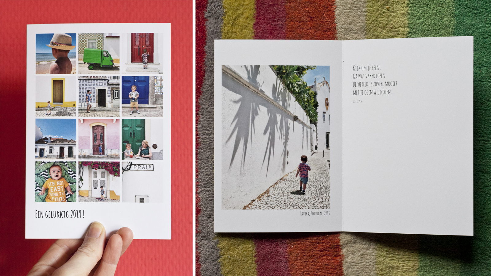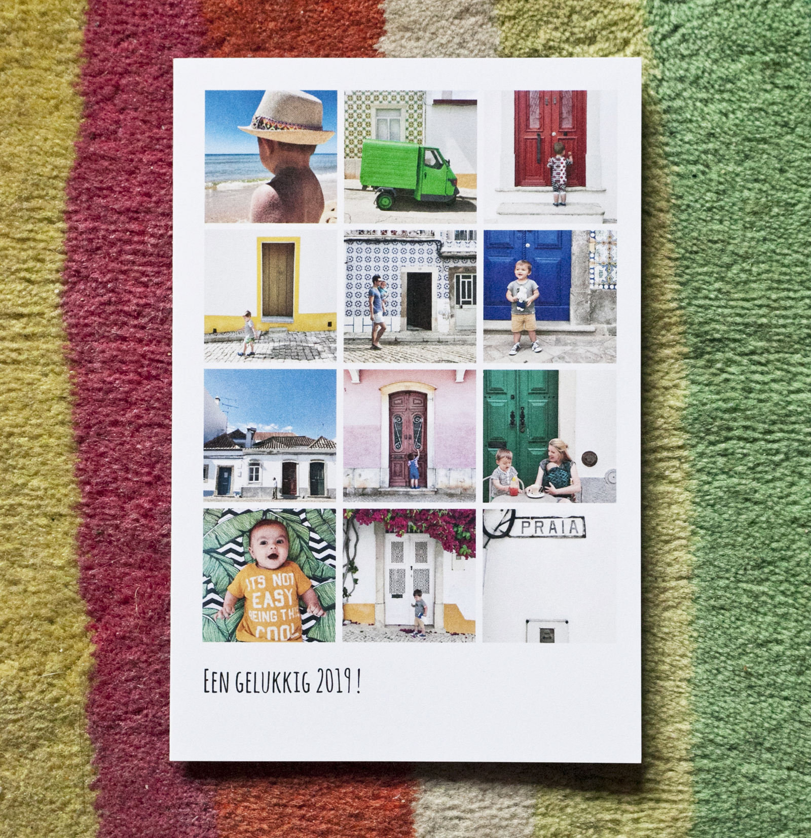Ik gebruikte vrolijke vakantiefoto’s in pastelkleuren die ik afgelopen mei in Portugal maakte. Feelgood. Afgedrukt op een dubbele kaart en op extra dik en mat papier heeft de kaart een mooie luxe uitstraling. De kleuren komen ook prachtig naar voren. En handig: decemberzegels kun je nog gebruiken t/m 5 januari. Ik moet ze nog posten dus dat komt goed uit.