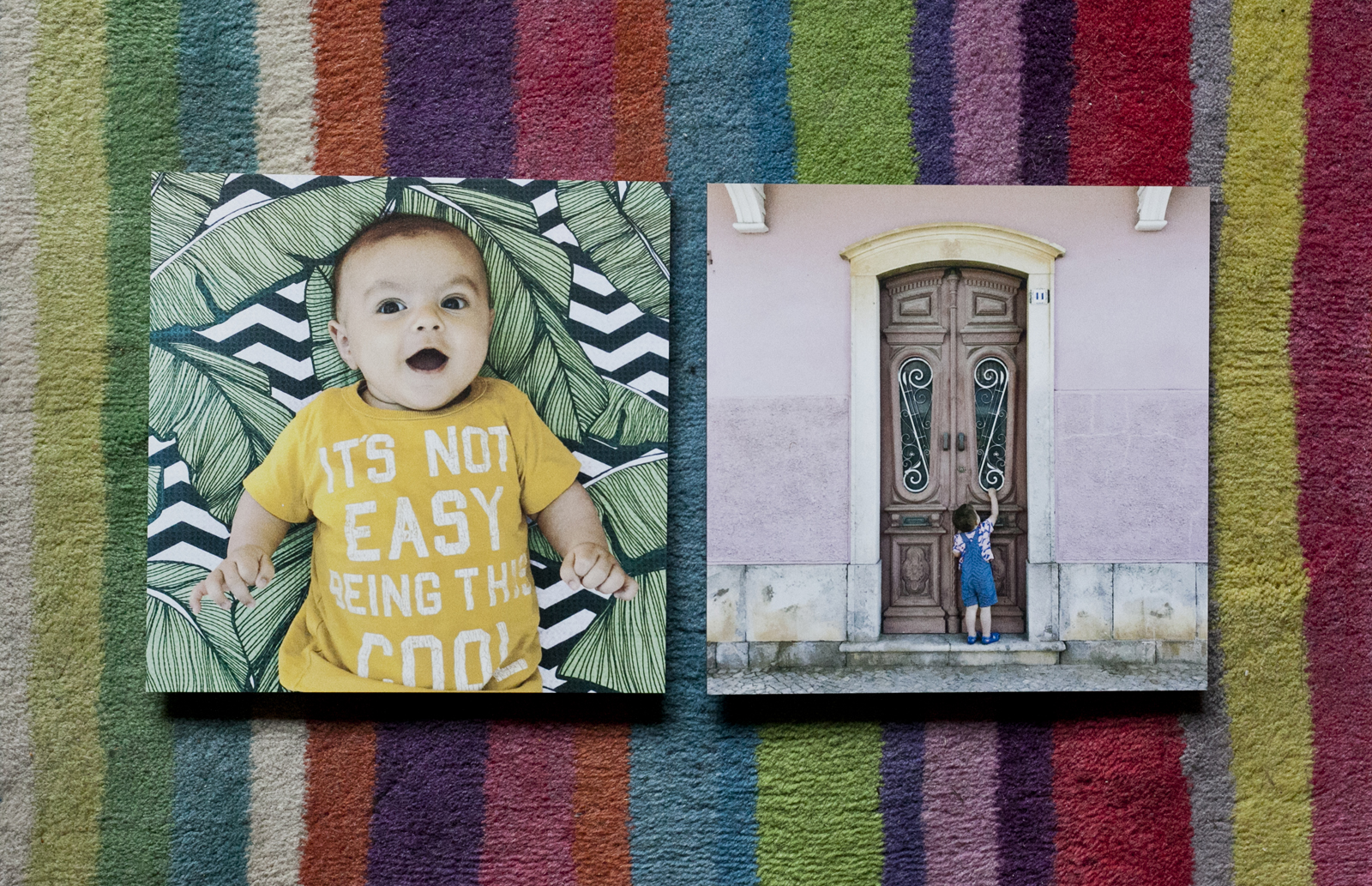 Ik ben nogal allergisch voor die grote canvas doeken. Daar heb ik echt niks mee. Doe mij maar aluminium. Daarop print je de foto haarscherp en helder. Het ziet er heel strak en luxe uit. Ik liet twee vakantiefoto’s printen in 20 x 20 cm op aluminium en was erg benieuwd naar de kwaliteit. Nou, die is echt prachtig kan ik je vertellen. Vooral de linkse foto waar Jonas op staat, die komt bijna tot leven. Zo mooi qua scherpte en kleur.