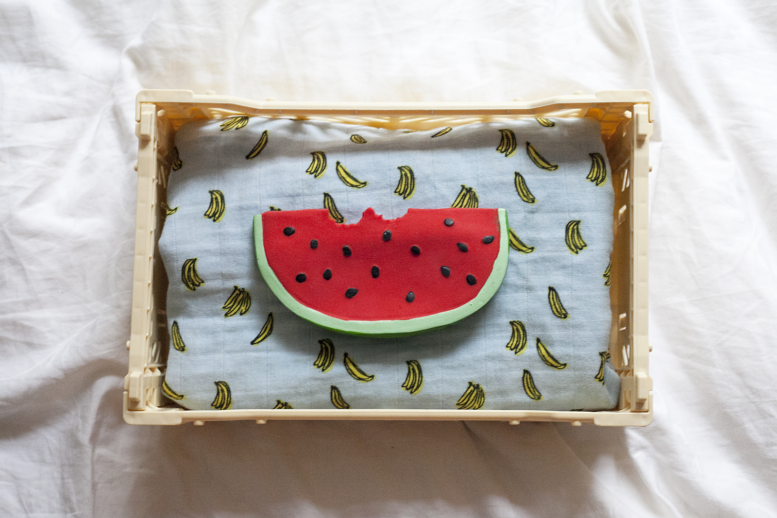 Hoe leuk is deze watermeloen?! Hij is van Oli & Carol en gemaakt van 100% natuurlijk rubber. Daarna is hij met de hand geschilderd met verf die geschikt is voor de voedingsmiddelen industrie. Hij is biologisch afbreekbaar en vrij van gifstoffen. Lekker om in de bijten dus! Waar Jonas eerst helemaal stil lag tijdens het verschonen komt nu de periode dat hij wil rollen, begint te trappelen enz. Ik geef hem vaker dit speeltje in zijn hand zodat hij afgeleid is. Er zit ook geen gaatje in dus schimmel krijgt geen kans. Ook superleuk voor in bad! Oli & Carol heeft een groot assortiment aan bijtspeeltjes, het is serieus een taak om te kiezen. € 14,95 bij Lazy Lama