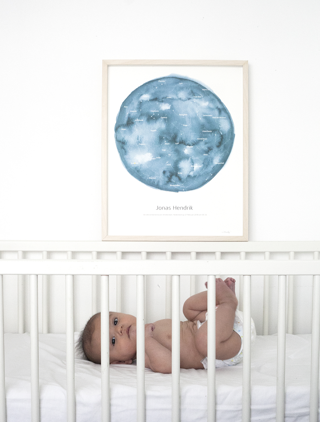 Ik trap af met MrStarskyAmsterdam, een supertof concept. Bij MrStarsky kun je namelijk unieke posters laten maken met de stand van de sterren op dat ene bijzondere moment. De nadruk ligt op het moment dat je kindje wordt geboren. Maar sinds kort is er nog een stijl bijgekomen die zich leent voor allerhande momenten. Denk bijvoorbeeld aan het moment dat je elkaar voor het eerst ontmoette, ging trouwen, je zoveel jarig jubileum vierde of misschien wel op de top van de Himalaya stond. Alles kan. Het resultaat is een prachtige, blijvende herinnering aan de muur.